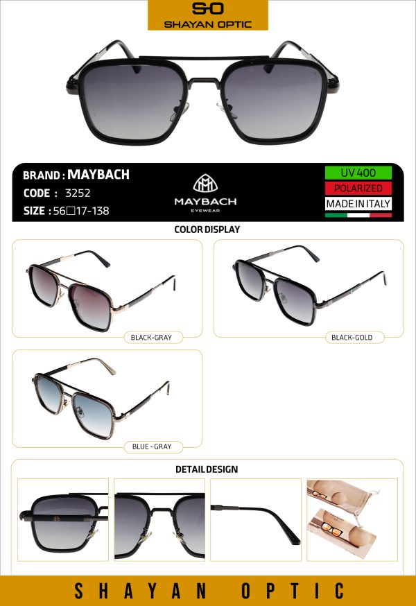 عینک آفتابی برند مایباخ مدل 3252 با عدسیهای فیلتر UV400 و طراحی خوشفرم برای استفاده روزمره و سفر. فریم سبک و مقاوم، مناسب صورتهای مختلف؛ گزینهای عالی برای رانندگی و فعالیتهای روزانه. ارسال سریع از اپتیک شایان و گارانتی اصالت کالا.