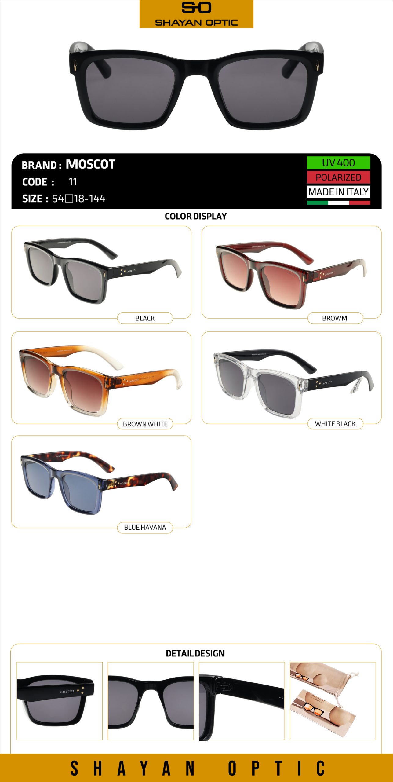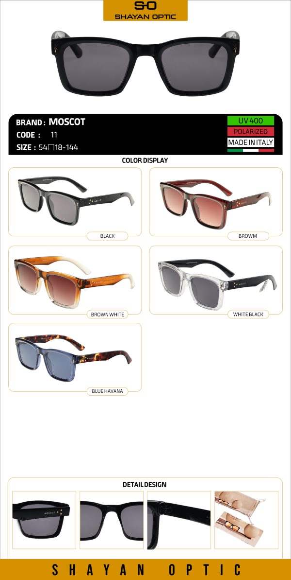 عینک آفتابی برند ماسکات مدل 11 با عدسیهای فیلتر UV400 و طراحی خوشفرم برای استفاده روزمره و سفر. فریم سبک و مقاوم، مناسب صورتهای مختلف؛ گزینهای عالی برای رانندگی و فعالیتهای روزانه. ارسال سریع از اپتیک شایان و گارانتی اصالت کالا.