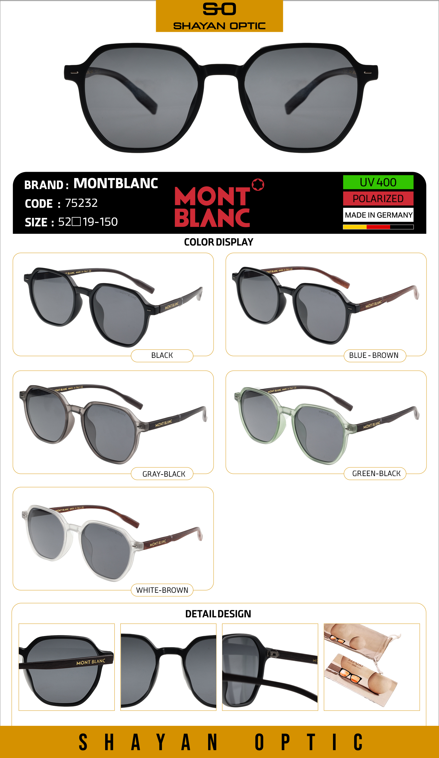 اگر به دنبال عینکی شیک، بادوام و استاندارد هستید، مون‌بلان مدل 75232 انتخابی هوشمندانه است. این مدل با فیلتر UV400 از چشم‌ها در برابر اشعه‌های مضر خورشید محافظت می‌کند و در بسیاری از رنگ‌ها ارائه می‌شود تا با سبک شخصی شما هماهنگ شود. لنزهای باکیفیت، کنتراست دید را بهبود می‌دهند و خستگی چشم را در طول روز کاهش می‌دهند؛ چه هنگام رانندگی زیر نور مستقیم آفتاب، چه در پیاده‌روی‌های طولانی یا سفر. فریم سبک و مقاوم این عینک، فشار را روی بینی و گوش‌ها کم می‌کند و به‌خاطر طراحی ارگونومیک، روی صورت به‌خوبی می‌نشیند. این محصول برای استفاده روزمره، استایل‌های کژوال و نیمه‌رسمی مناسب است و با لباس‌های مینیمال یا کلاسیک به‌خوبی ست می‌شود. در اپتیک شایان، تمامی مدل‌ها با تضمین اصالت، امکان مرجوعی طبق قوانین فروشگاه و ارسال سریع ارائه می‌شوند. برای تکمیل تجربه، می‌توانید از میان اکسسوری‌های نگهدارنده و کاورهای متنوع موجود در فروشگاه نیز انتخاب کنید.